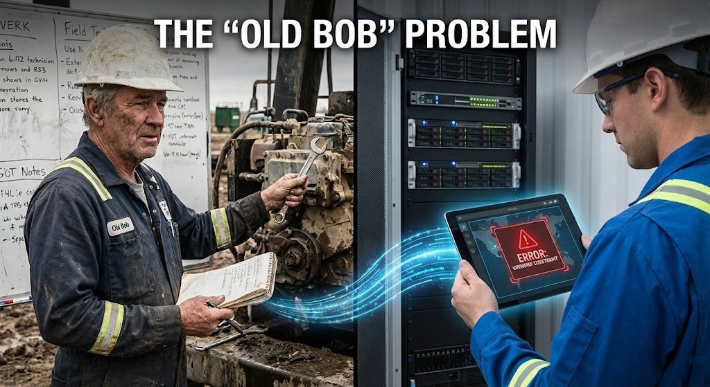 Old Bob knows you can’t send a 20-foot truck to the downtown loading dock after 8:00 AM. Bob knows that the customer at 12 Main St. has a gate code that isn’t in the CRM. Bob knows which machines need a wrench and which ones need a kick.